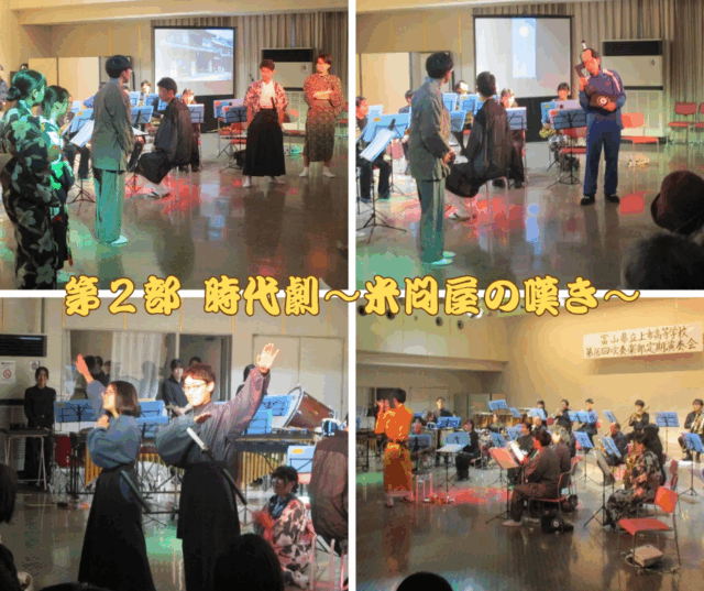 今回の目玉の第2部では、毎年ナレーションをお願いしている放送部に加え、演劇部員が演者として参加し、米問屋と悪代官・城主・侍のドタバタを描いたを音楽時代劇を作り上げました。笑いあり涙ありのステージとなり大いに盛り上がりました。
